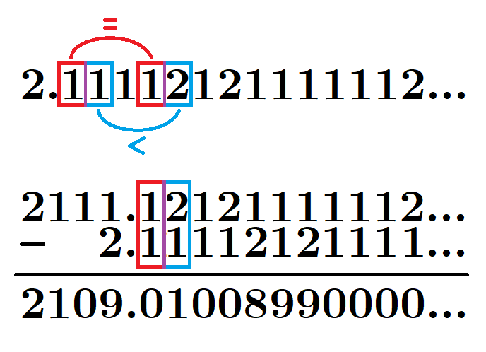 density of αℕ fractional parts in [0,1] – a constructive approachmarch 20th, 2023when α is a rational number, αℕ can only have a fairly limited number of decimal expansions after the decimal place. for exemple, we can't converge to anything of the form n.391737636712&c within (1/3)ℕ. however, when α is irrational, αℕ seems to be able to approach any desired decimal expansion... but is this true? this question is quite essential, for example, to show that (ein )n≥0 defines a hilbertian basis of a particular hilbert space (wink wink fourier), as well as to understand the technique of irrational rotation found, for example, in banach-tarski's ball-doubling result. so, how to convince oneself of the well-foundedness of this observation, constructively ? first, here is an analogous observation on the irrationals α ∈ ]0,1[ : since (n+1)α−nα = α<1, we can get any integer as an integer part. to find such an integer, we choose m our desired integer part, and we find nα ⪎ m ⇔ n ⪎ m/α ⇐ from the get-go, there must be at least two bgits (digits, but in base b) which are repeated infinitely often in the bcimal digits of α, otherwise we would have a repeating bgit, and therefore there would exist p ∈ ℕ such as bp(b−1)α ∈ ℕ. we can therefore write two of these bgits 1 and 2, with 1<2, such that there is an infinitely many ...12... and ...21... in the bgits. this is also not possible with bp(bq−1) for q ∈ ℕ, so there must also be infinitely many ...11... OR ...22.. ., possibly both. if it is ...11..., then there is ...11...12... somewhere (infinitely often, in fact) in said bgits. if it's ...11..., then there's ...21...22... somewhere (infinitely often, in fact) in said bgits. it's interesting bcs that means there are two distinct positions with the same bgit (or same sequence of bgits, in fact) followed by bgits which are lower than each other, as for example in 3.141592... where you have 1=1 and 4<5, and by explicitly noting the positions in the bgits of α so we have ![]() i like to summarize this algorithm with this image: ![]() there you go, i hope y'all found it interesting!